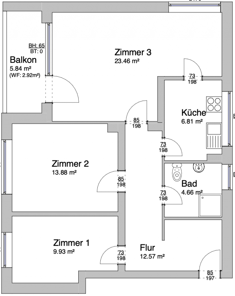 Die Wohnfläche von ca. 74 m² verteilt sich auf einen Eingangsbereich mit Platz für einen praktischen Einbauschrank; ein tagesbelichtetes Duschbad mit Waschmaschinenanschluss; zwei Schlafzimmer; eine Küche, die über den Flur und übers Wohnzimmer bzw. den Essbereich zugänglich ist, sowie ein Wohnzimmer mit Essbereich und Zugang zur Loggia. Diese bietet einen Blick ins Grüne und ist mit einer elektrischen Markise als Sonnenschutz ausgestattet.