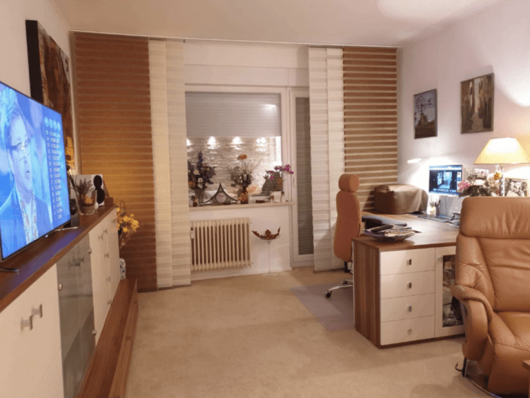 Die Fenster verfügen über elektrische Außenjalousien, die auch über eine Funk-Fernbedienung steuerbar sind. Im Wohnzimmer ist zudem ein Schiebevorhang vorhanden, der viele Verstellmöglichkeiten für die optimale Beschattung je nach Wunsch und Bedarf bietet.