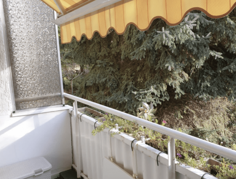 Die Wohnung ist im Hochparterre gelegen, verfügt über einen optimalen Schnitt und ist aufgeteilt auf zwei Zimmer, ein Badezimmer, eine praktische Abstellkammer, eine Küche sowie einen sonnigen Balkon mit einer Markise als Sonnenschutz.