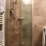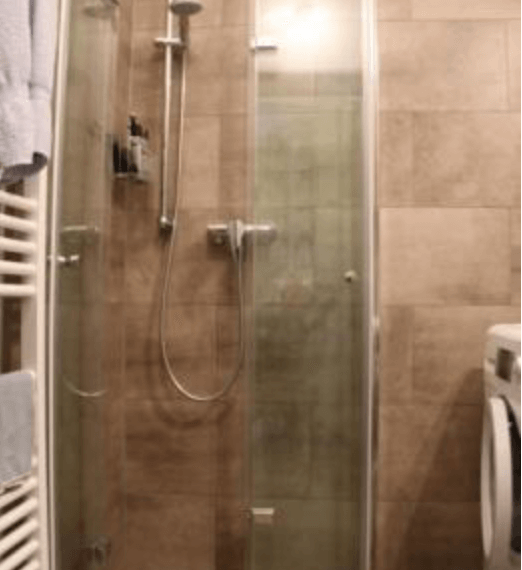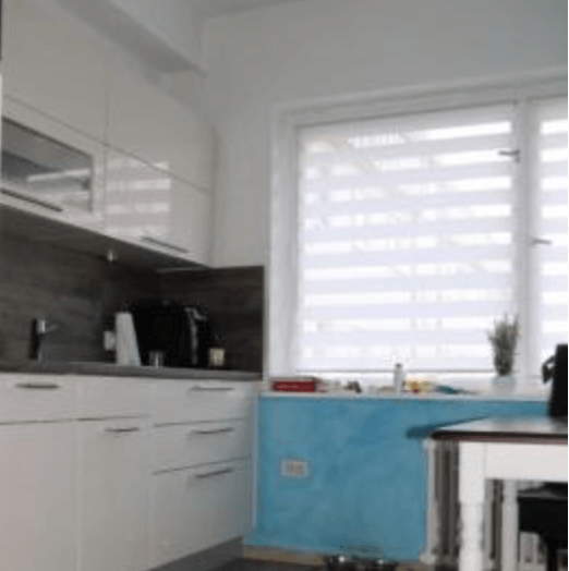 Zwischen Wohnzimmer und Küche ist das modern sanierte Duschbad sowie das separate WC gelegen. Die Küche ist mit einer hochwertigen Einbauküche ausgestattet.