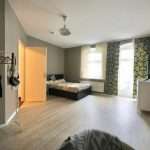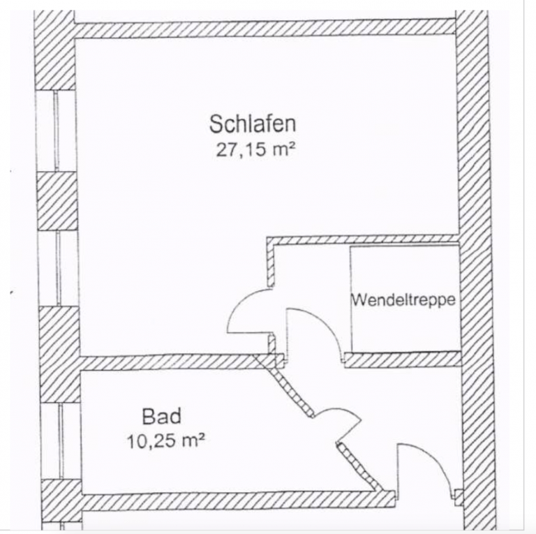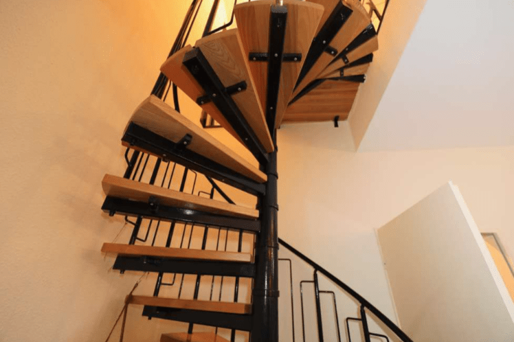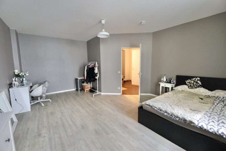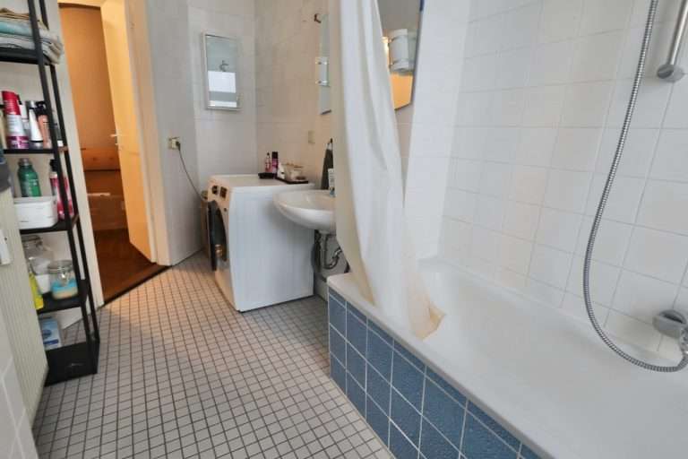 Im oberen Bereich der Wohnung, welcher mittels einer schönen und modernen Wendeltreppe begehbar ist, befinden sich das Badezimmer und das großzügige Schlafzimmer mit Zugang zum Balkon. Das tagesbelichtete Badezimmer ist mit einer Badewanne ausgestattet und bietet ausreichend Platz für eine Waschmaschine.