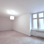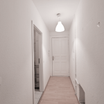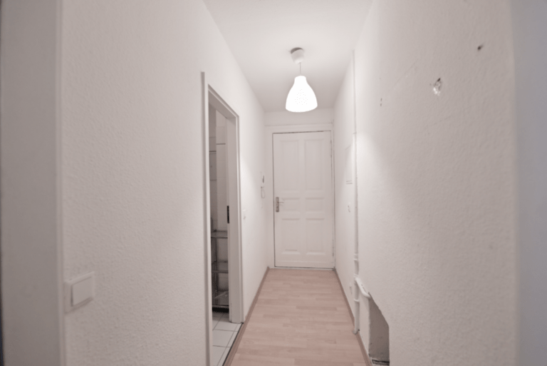 Im Flur und im Wohn-/Schlafzimmer ist Laminat verlegt, die Wände sind tapeziert. Die Kunststofffenster sind doppelt verglast.