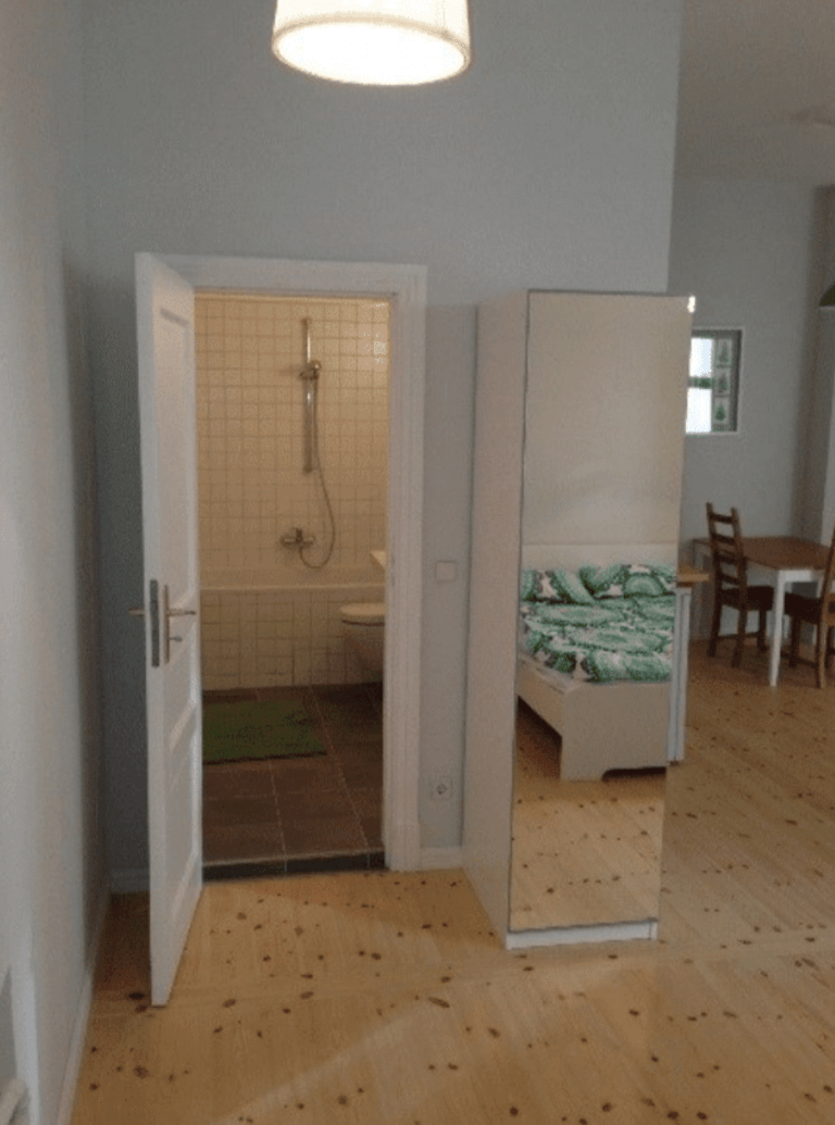 Bei der Wohnung handelt es sich um eine großzügig geschnittene 1 bzw. 1,5 Zimmer-Wohnung mit Balkon und innen liegendem Bad. Die Wohnung selbst befindet sich in ruhiger Lage im Hinterhaus. Auf dem Grundriss ist eine Wand zur Trennung des Schlafzimmers eingezeichnet, die zurzeit nicht vorhanden ist.