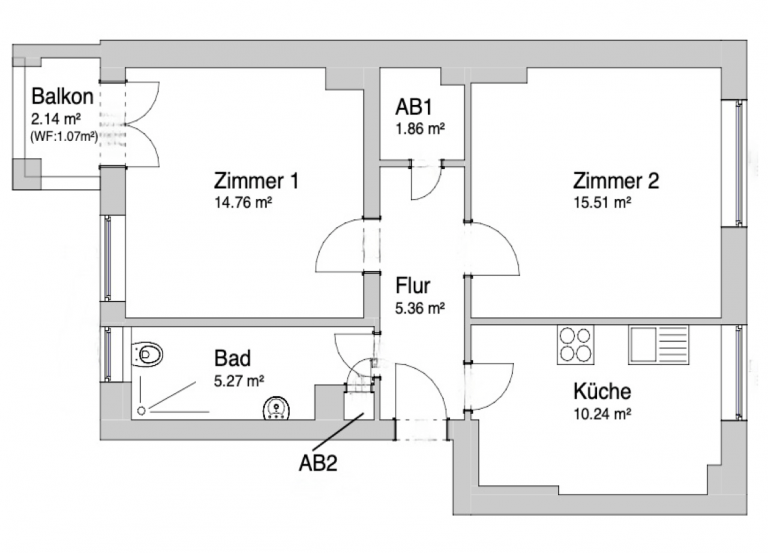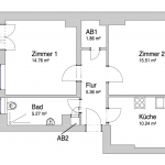 Auf einer Wohnfläche von ca. 54,15 m² verteilen sich ein Flur; ein praktischer Abstellraum; zwei Zimmer; ein tagesbelichtetes Badezimmer, ausgestattet mit einer Dusche, und eine Küche. Die vom Wohnzimmer aus zugängliche Loggia bietet einen idyllischen Blick ins Grüne.