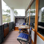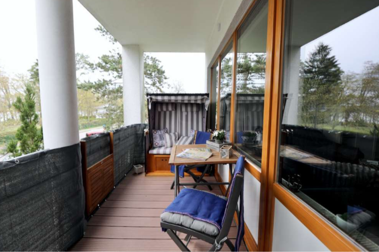 Vom Wohnzimmer aus ist der ca. 8 m² große, westlich ausgerichtete sowie überdachte Balkon zu begehen, der Platz für Entspannung oder für ein gemütliches Beisammensein bietet.