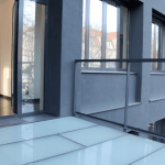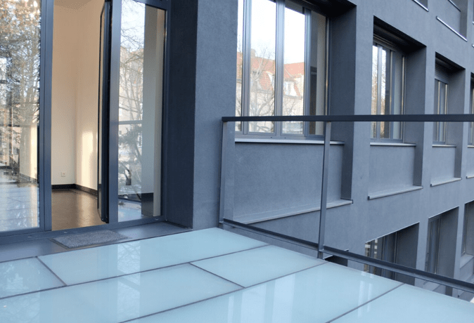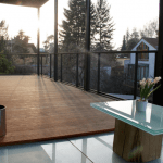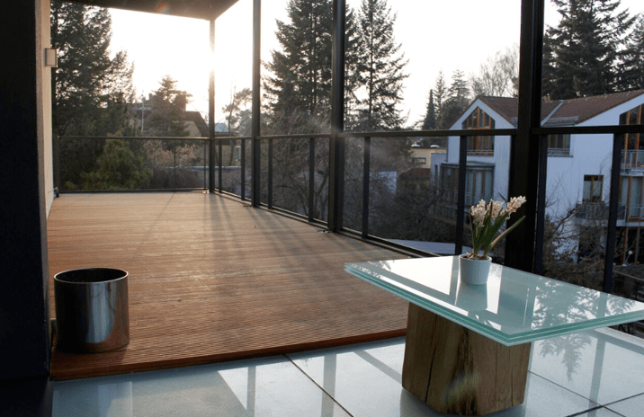 30 qm große Terrasse erreichbar ist. Diese zeichnet sich durch ihren Bodenbelag aus, welcher zum Teil aus Holz und auch aus Glas besteht. Eine weitere 10 qm große Terrasse ist auf der anderen Seite des Wohnzimmers gelegen.