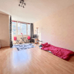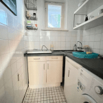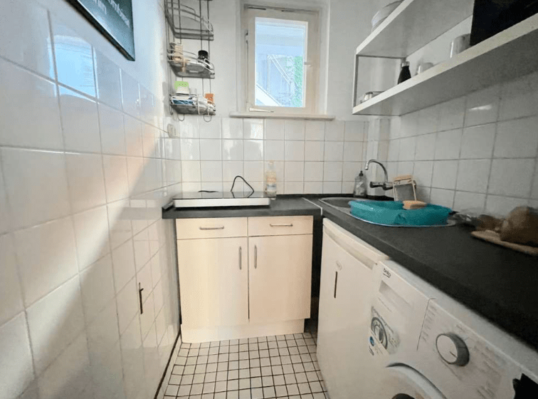 Im Flur sowie im Wohn-/Schlafbereich ist ein praktischer Laminatboden verlegt. Das Badezimmer und die Küche sind hell gefliest, und die Wände sind tapeziert.