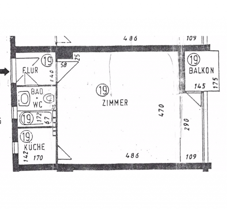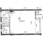 Auf einer Wohnfläche von ca. 35 m² verteilen sich ein Flur, eine Küche mit Waschmaschinenanschluss, ein Wannenbad sowie ein Wohn-/Schlafbereich mit Zugang zum Balkon.
