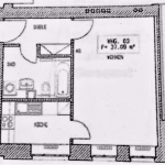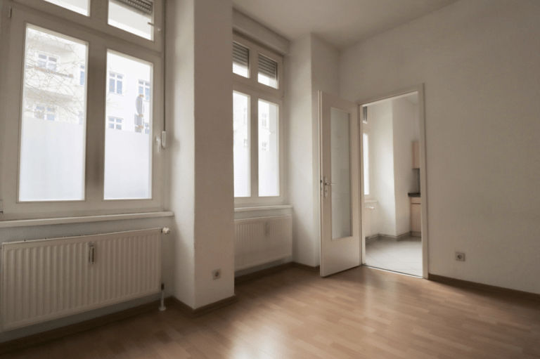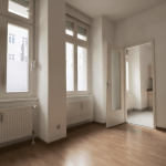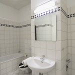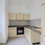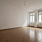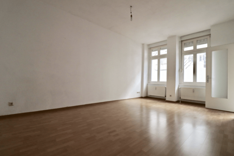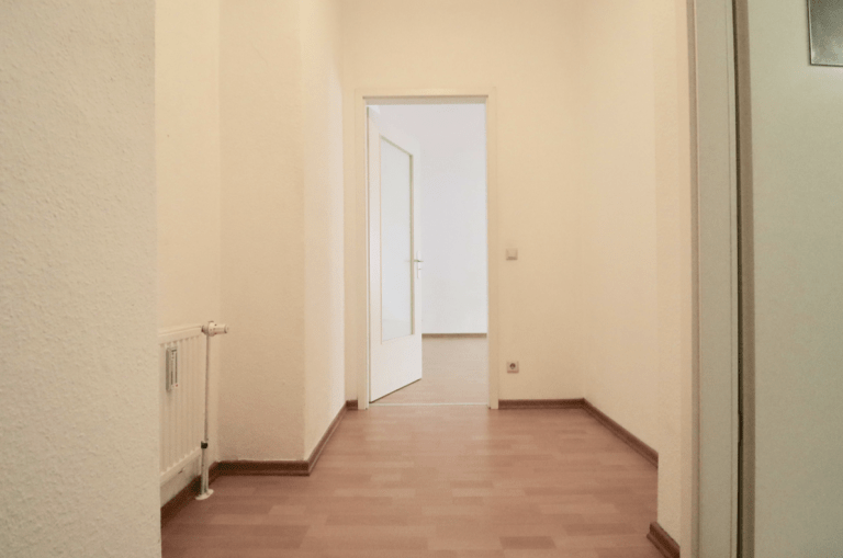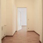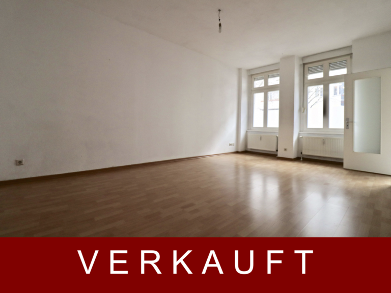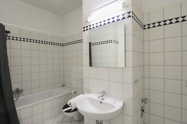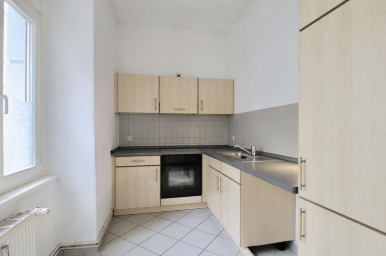 Die ca. 37 m² große Wohnung liegt im Erdgeschoss des Vorderhauses und verfügt über einen Flur, ein großzügiges Zimmer mit Laminatboden, ein hell gefliestes Wannenbad mit Waschmaschinenanschluss und eine Küche, die mit einer komfortablen Einbauküche ausgestattet ist und Platz für einen Frühstückstisch bietet.