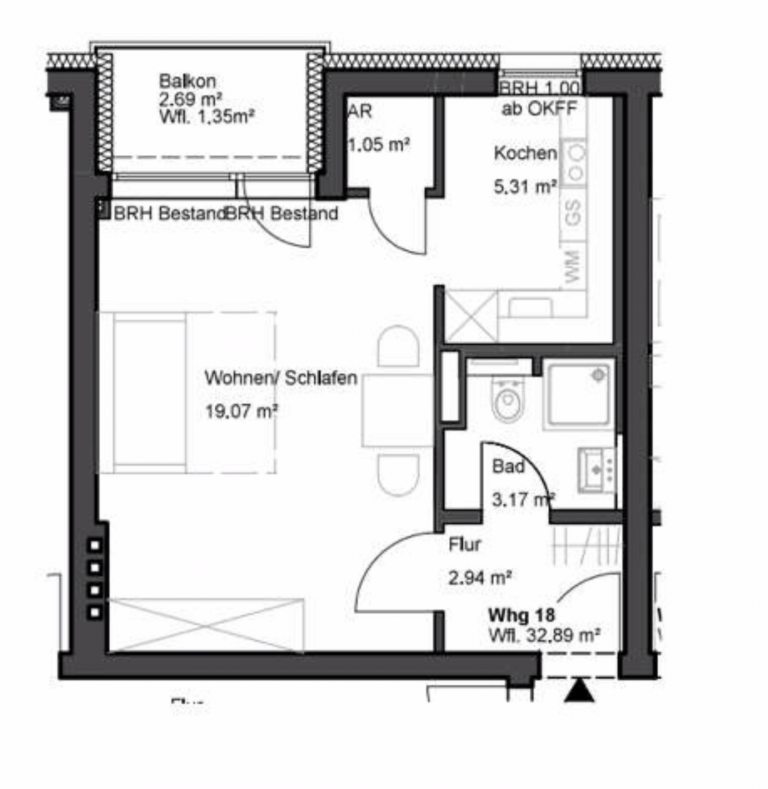 Im Wohnzimmer stehen knapp 20 m² zum Wohnen, Schlafen oder Essen zur Verfügung. Der südwestlich ausgerichtete Balkon bietet Platz für Erholung und zum Entspannen.