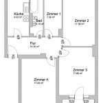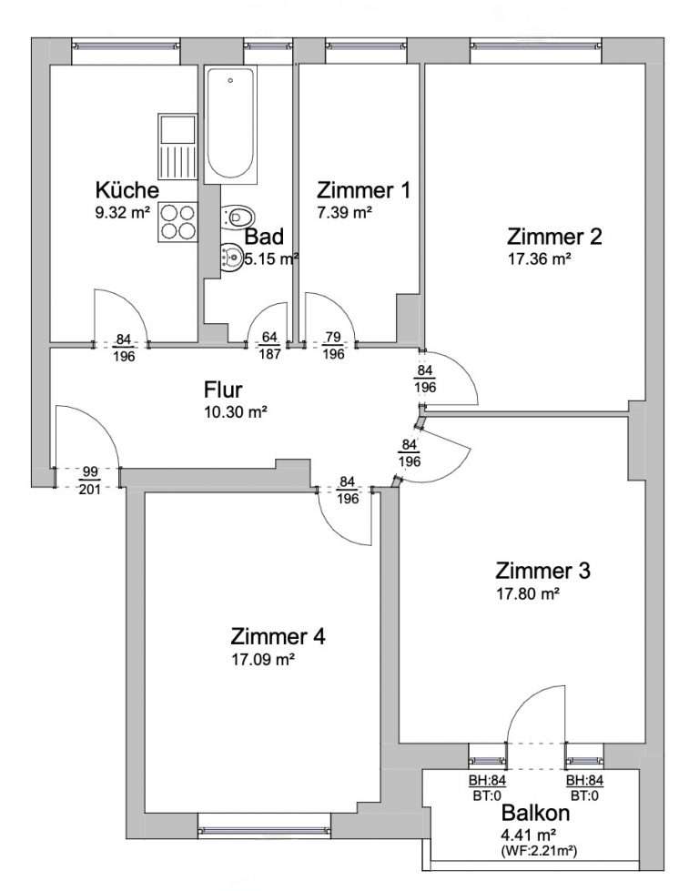 Eine Wohnfläche von ca. 86,62 m² verteilt sich auf einen Flur, eine Küche, ein tagesbelichtetes Badezimmer mit Badewanne und Hadtuchwärmer, zwei Schlafzimmer, ein halbes Zimmer und ein Wohnzimmer mit Zugang zum südwestlich ausgerichteten Balkon.