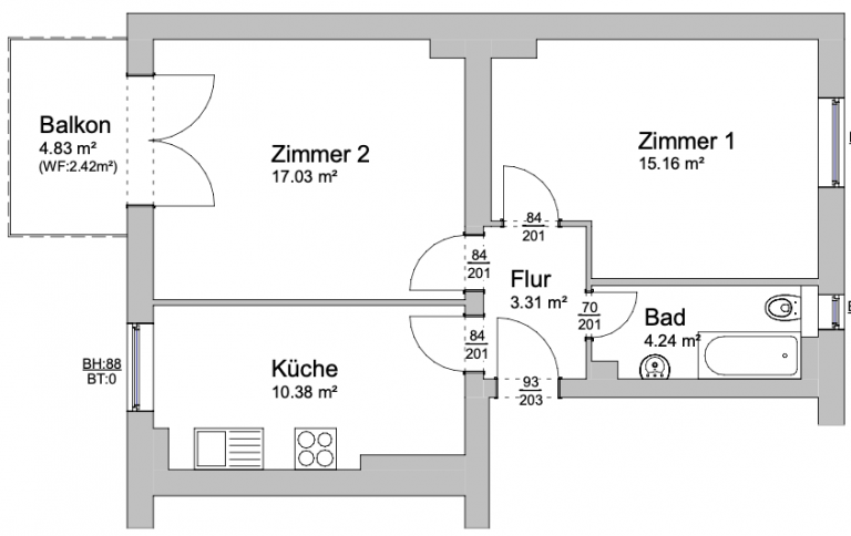 Eine Wohnfläche von 52,54 m² verteilt sich auf einen Flur; ein tagesbelichtetes Badezimmer, welches mit einer Badewanne ausgestattet ist; eine Küche, ausgestattet mit einer Einbauküche und genügend Platz für eine Sitzecke; ein Schlafzimmer und ein Wohnzimmer nebst überdachtem Balkon, der einen schönen Blick in den parkähnlichen Gemeinschaftsgarten bietet.
