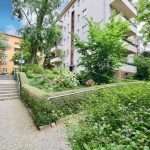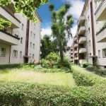 Die Wohnanlage ist zurückversetzt hinter einer großzügigen, parkähnlichen Fläche positioniert, grenzt zu keiner Seite an eine Straße und ist somit ruhig gelegen.
