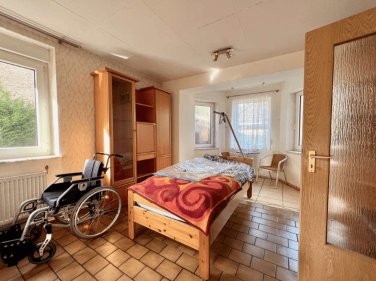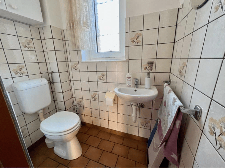 Die Fußböden im Erdgeschoss sind mit Fliesen versehen, im Obergeschoss ist im Flurbereich noch der ursprüngliche Dielenboden vorhanden. In den beiden Schlafzimmern sind Spanplatten verlegt. Die Kunststofffenster sind zweifach verglast und im Erdgeschoss mit elektrischen Rollladen ausgestattet. Die Wände sind tapeziert.