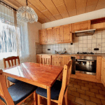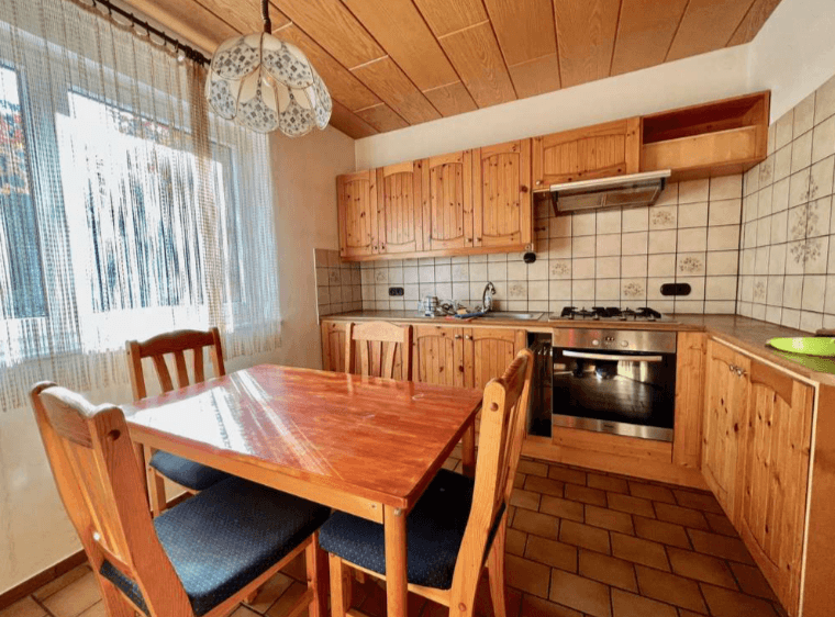 Der Eingangsbereich verfügt über einen Windfang und bietet genügend Platz für eine Garderobe sowie zusätzlichen Stauraum. Weiterhin steht sogleich ein praktisches Gäste-WC zur Verfügung. Die Küche ist mit einer Einbauküche aus massivem Holz ausgestattet und bietet nicht nur reichlich Arbeits- und Abstellflächen sondern auch ausreichend Platz für einen Esstisch. Das großzügige Wohnzimmer verfügt über einen charmanten Erker.