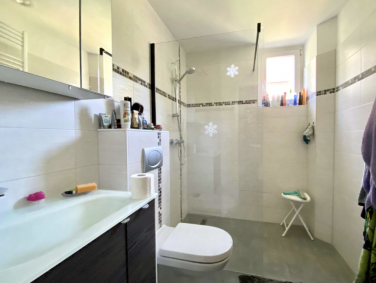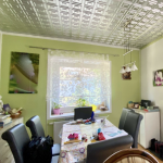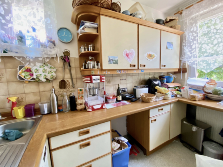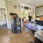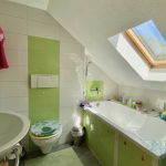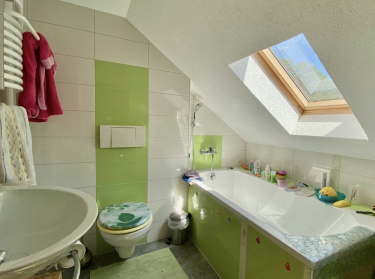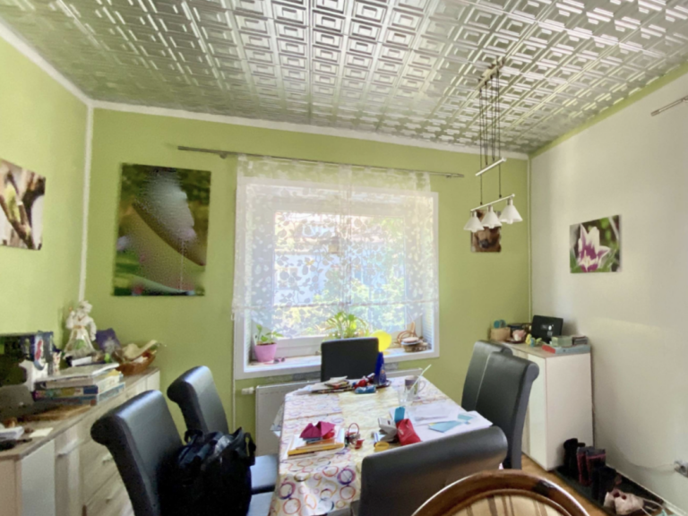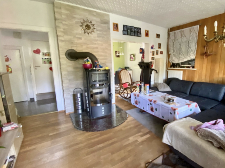 Im Wohnzimmer und Esszimmer des Erdgeschosses ist Parkettboden verlegt. Das Wohnzimmer verfügt über einen Ofen, der an kalten Wintermonaten für ein warmes Raumklima und Gemütlichkeit sorgt. Das Schlafzimmer ist mit Laminatboden ausgestattet, die Küche mit PVC-Boden. Der Flur und das Duschbad sind modern hellgrau gefliest. In der oberen Ebene ist Laminatboden sowie Auslegware verlegt. Das Wannenbad erstrahlt in einem frischen Grün.