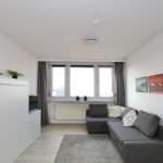 Die zweifach verglasten Kunststofffenster erstrecken sich über die gesamte Breite des Wohn-/Schlafzimmerbereiches, welcher eine westliche Ausrichtung hat. Die Wände sind tapeziert und im Wohnbereich ist pflegeleichtes, helles Laminat verlegt. Die Deckenhöhe beträgt ca. 2,60 m.