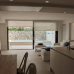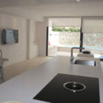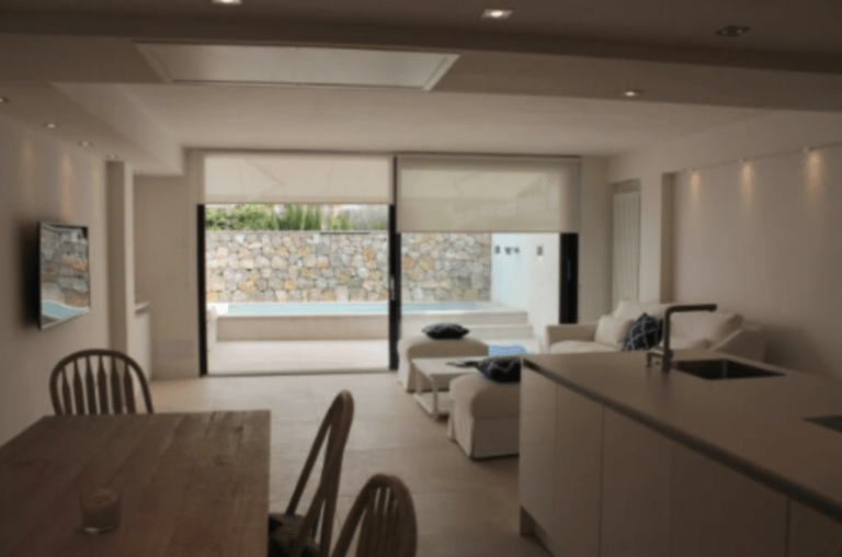 Im Erdgeschoß befindet sich ein geräumiges Wohnzimmer mit einer offenen Küche. Die Küche ist ausgestattet mit hochwertigen Geräten der Marke Leicht. Ausserdem bietet die Küche Zugang zur Terrasse mit einem einladenden Pool zum Verweilen und Entspannen.