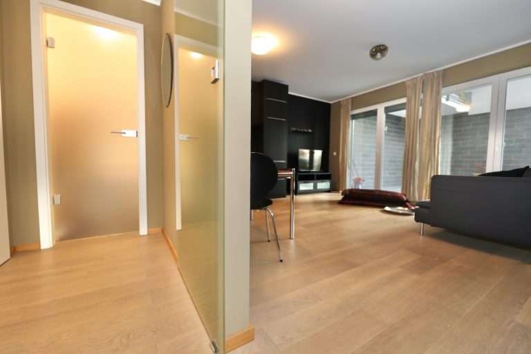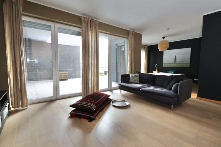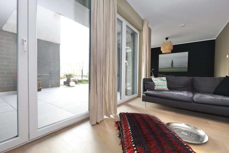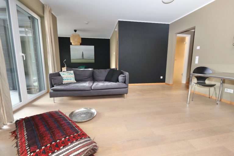 Die Wohnräume verfügen über bodentiefe, großflächige Fensterfronten, die viel Licht in die Wohnung lassen, mit Blick auf die teils überdachte und teils sonnige Terrasse, die sich über die gesamte Breite der Wohnung erstreckt.