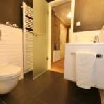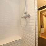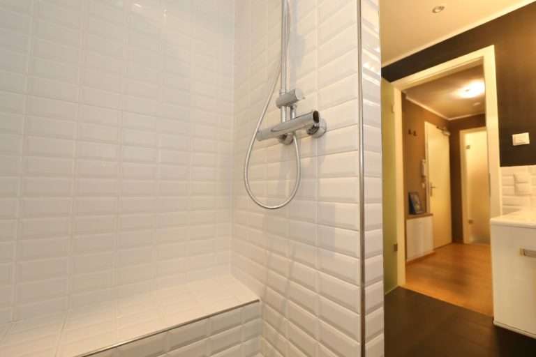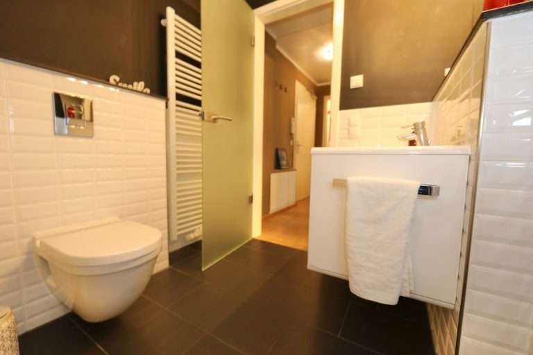 Der Eingangsbereich bietet ausreichend Platz für die Garderobe und verfügt über einen praktischen Hauswirtschaftsraum, der zudem viel Stauraum bietet. Das Badezimmer ist modern konzipiert mit Einbaumöbeln und einer Dusche, die eine praktische Sitzbank beinhaltet.