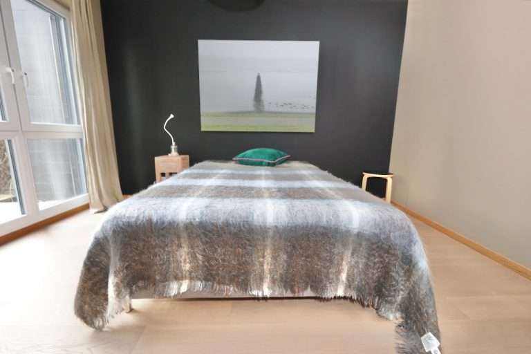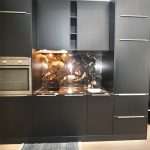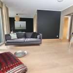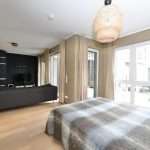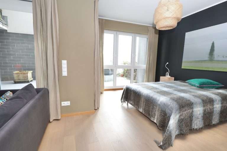 Das Herz der Wohnung ist der loftartige Wohn-/Essbereich mit einer edlen, schwarz matten Einbauküche, die sich elegant im Wohnbereich einfügt, und weiterhin der offen gehaltene Schlafbereich mit begehbarem Kleiderschrank.
