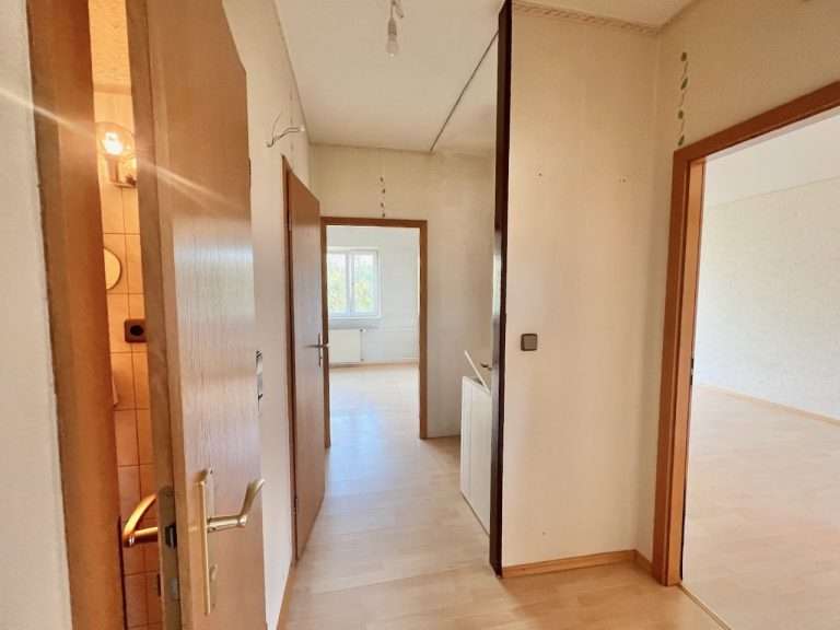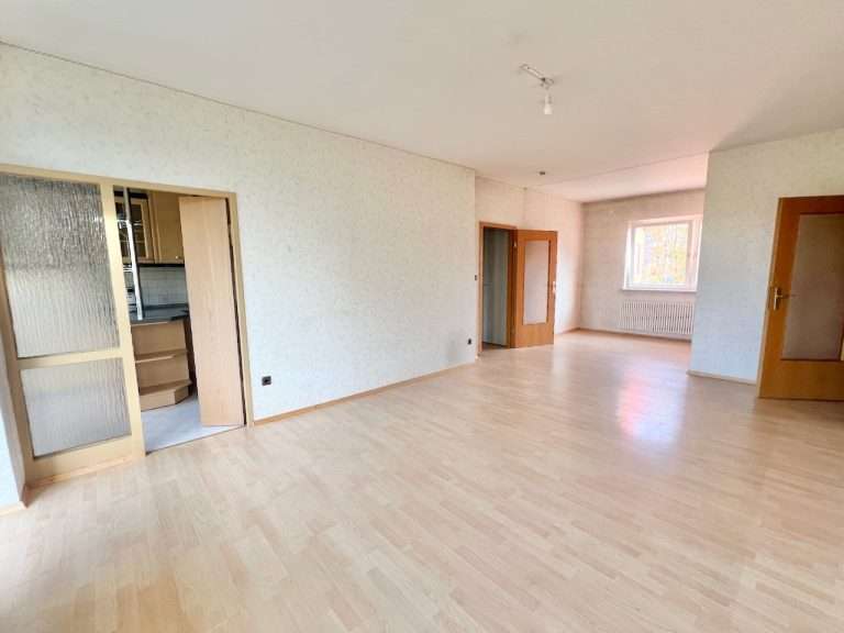 Auf einer Wohnfläche von ca. 80,54 m² verteilen sich ein Eingangsbereich; eine Küche; ein Flur mit Zugang zum nach hinten gelegenen Schlafbereich mit zwei Schlafzimmern; ein Badezimmer, ausgestattet mit einer Badewanne; ein separates WC und ein Wohnzimmer mit Zugang zur süd-westlich ausgerichteten Loggia. Diese bietet einen schönen Blick auf die großzügige und gepflegte Gartenanlage des Wohngebäudes. Die Küche ist sowohl vom Flur als auch vom Wohnzimmer zu begehen.