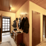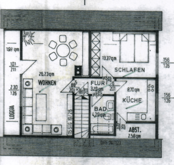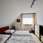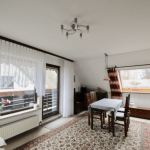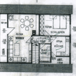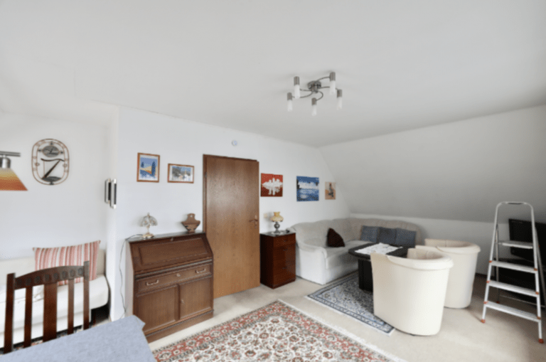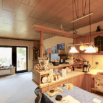 Im Obergeschoss verteilen sich auf ca. 60 m² zwei Zimmer, ein Badezimmer, ausgestattet mit einer Badewanne, sowie eine weitere, großzügige Küche mit Einbauküche und einer Speisekammer. Ein Balkon, der sich über die gesamte Länge eines Zimmers erstreckt, ist zudem vorhanden.