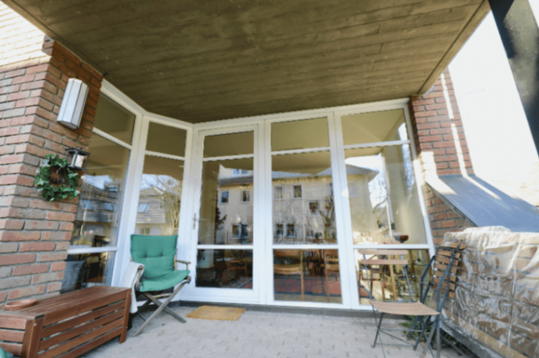 Das geräumige Wohnzimmer hat direkten Zugang zu der ca. 11 m² großen, überdachten Terrasse mit südlicher Ausrichtung, und es besteht ein Sondernutzungsrecht für den Gartenanteil - herrlich grün!