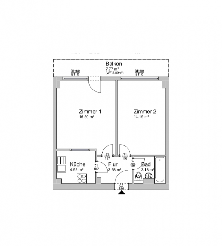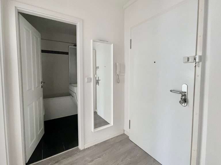Die Wohnräume sind mit einem modernen Laminatboden ausgestattet, und das Badezimmer ist gefliest. Die Wohnung verfügt über doppelt verglaste Kunststofffenster. Die Wände sind mit einer Raufaser-Tapete versehen, und die Deckenhöhe beträgt ca. 2,50 m.