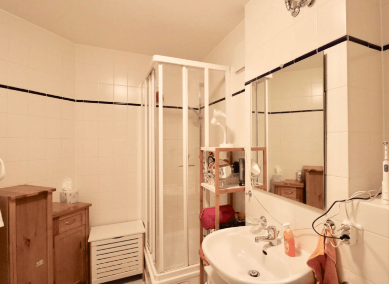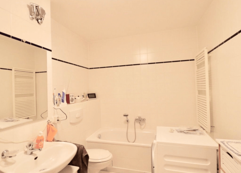 Auf ca. 57 m² verteilen sich ein Flur mit praktischer Abstellkammer, ein großes, hell gefliestes Wannenbad mit separater Dusche und viel Platz für eine Waschmaschine und zusätzlichen Stauraum, ein Wohnzimmer mit offener Einbauküche und ein Schlafzimmer, welches vom Wohnzimmer zugänglich ist.