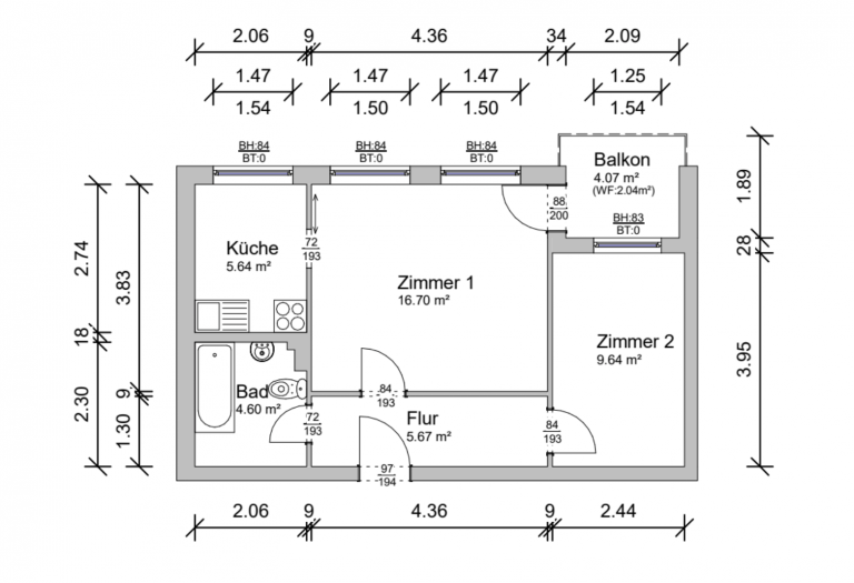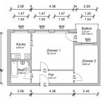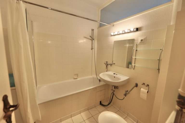 Auf ca. 44,29 m² verteilen sich ein Flur; ein Badezimmer, ausgestattet mit einer Badewanne und Handtuchwärmer; ein halbes Zimmer, ein Wohnzimmer mit Zugang zum südwestlich ausgerichteten Balkon und eine Küche mit Einbauküche.