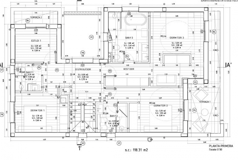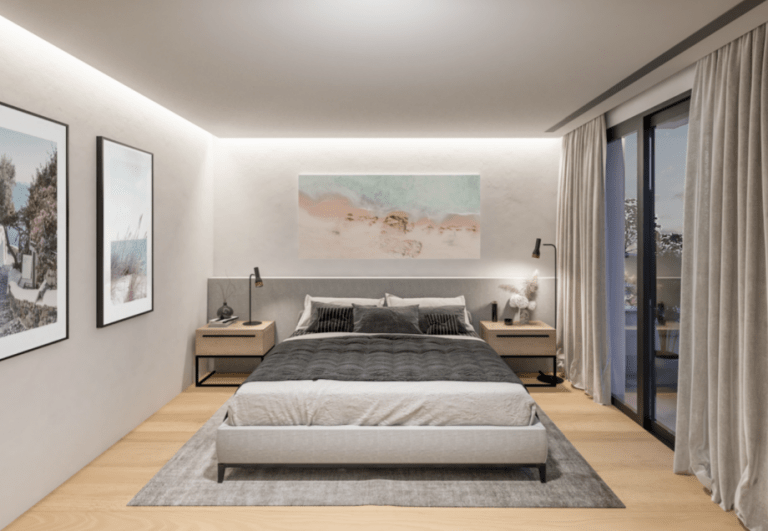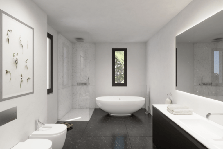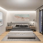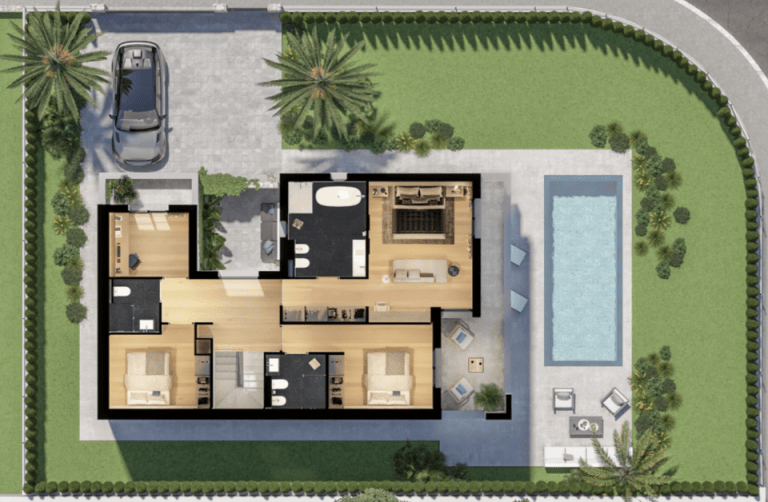 Im Obergeschoss sieht die Planung vier Zimmer vor, ausgestattet mit einem hochwertigen Holzparkett. Weiterhin stehen drei Badezimmer mit edler Marmorausstattung zur Verfügung. Zwei Schlafzimmer sind mit einem Badezimmer en-suite geplant.