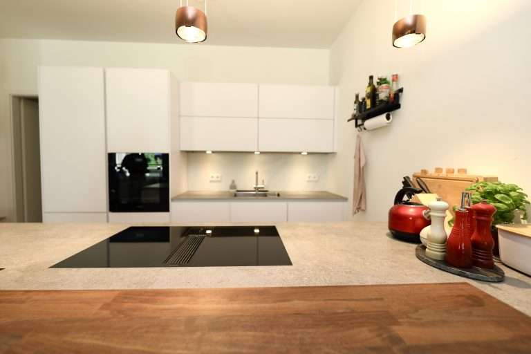 Der Wohn-/Essbereich mit offener Küche und Zugang zur ca. 11 m² großen, südwestlich ausgerichteten Terrasse ist das Herzstück der Wohnung.