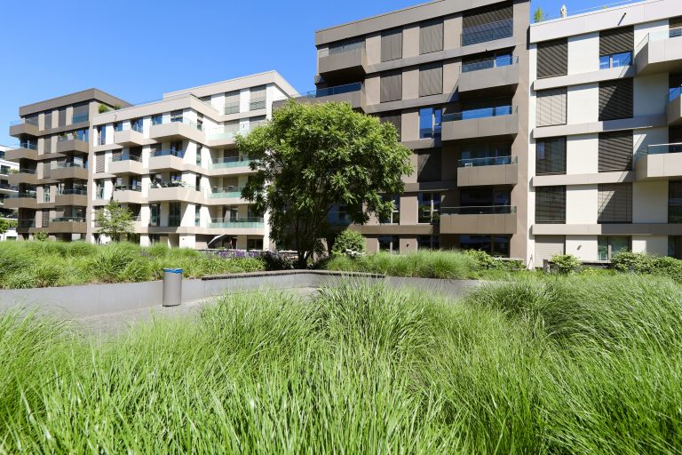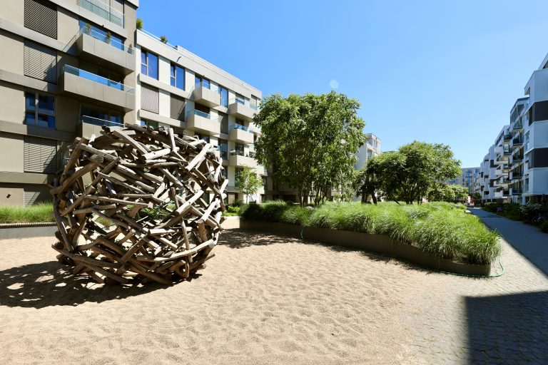 Das Wohnensemble wurde 2019 erbaut und verfügt über stilvoll angelegte, begrünte Außenanlagen.
