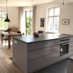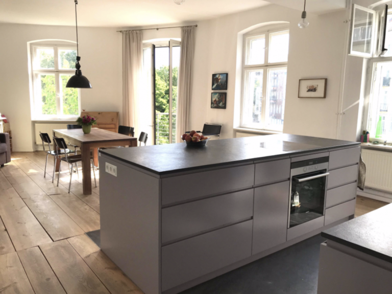 Die Küche ist mit einer hochwertigen Einbauküche aus Holz und einer edlen, schwarzen Schieferplatte mit praktischer Kücheninsel ausgestattet und offen gehalten zum großzügigen Essbereich.