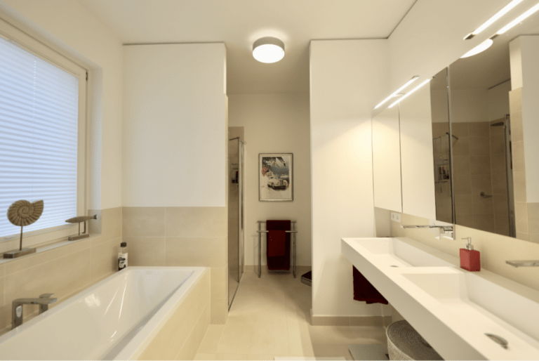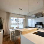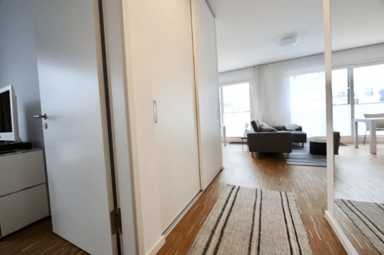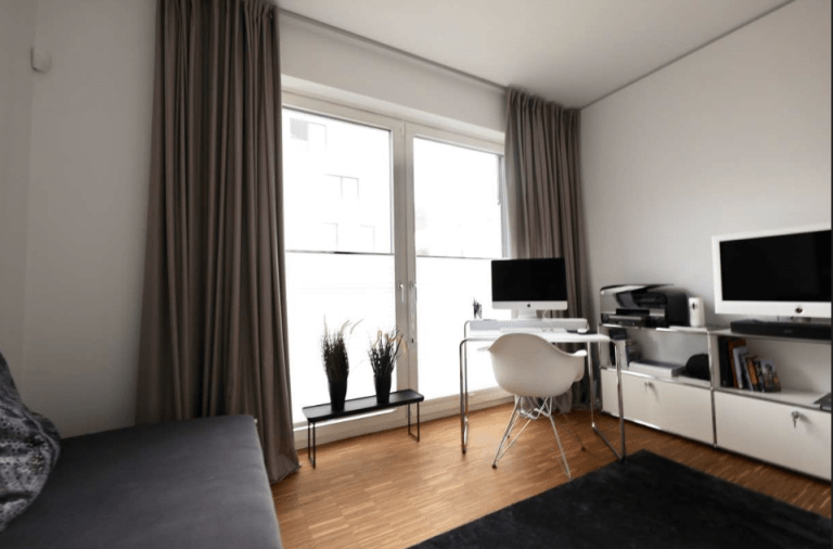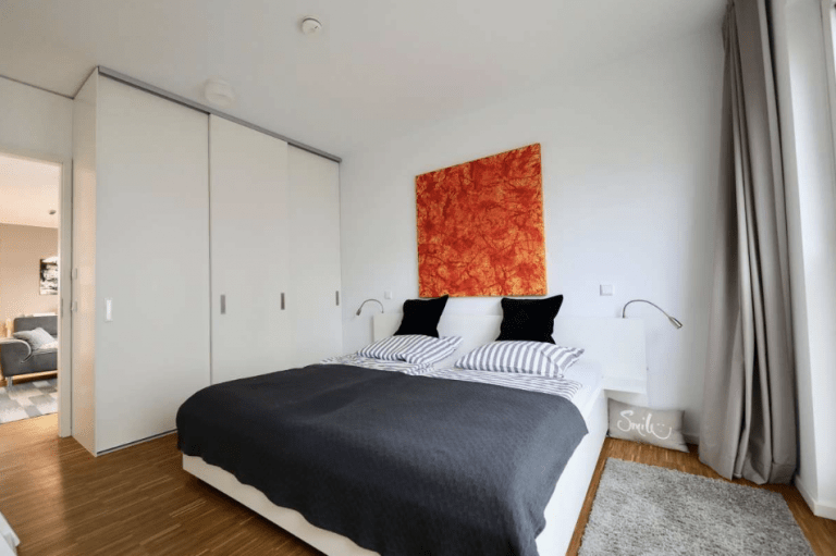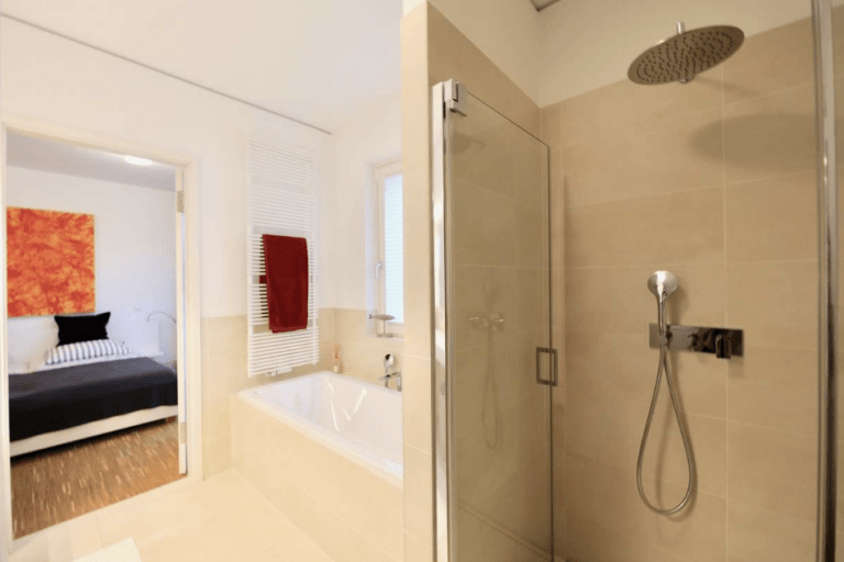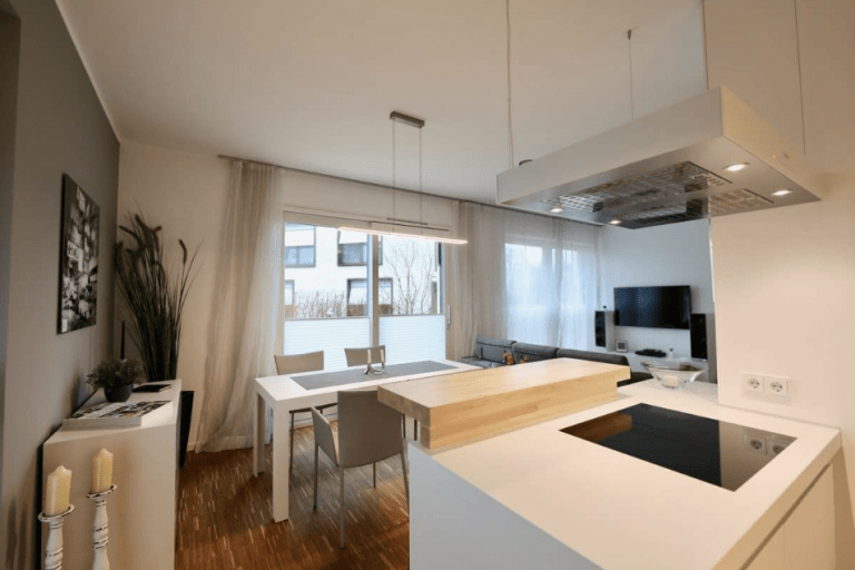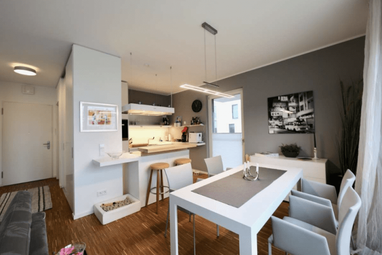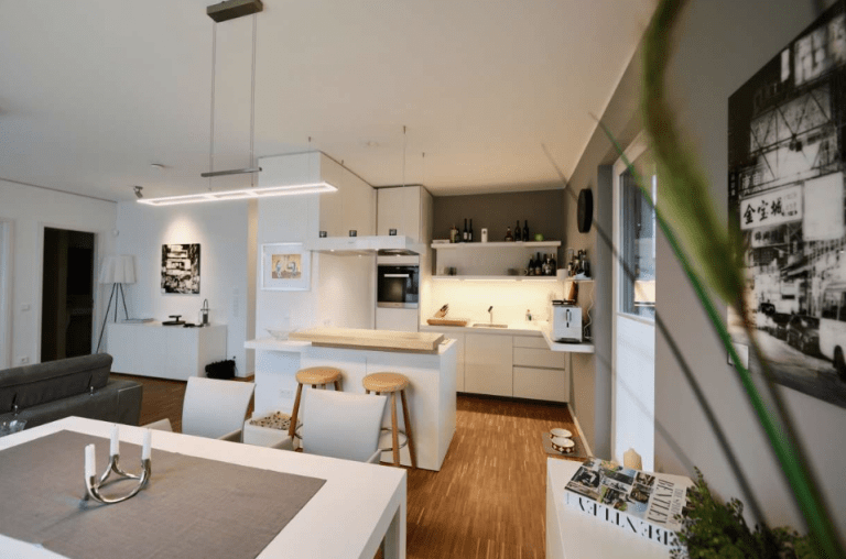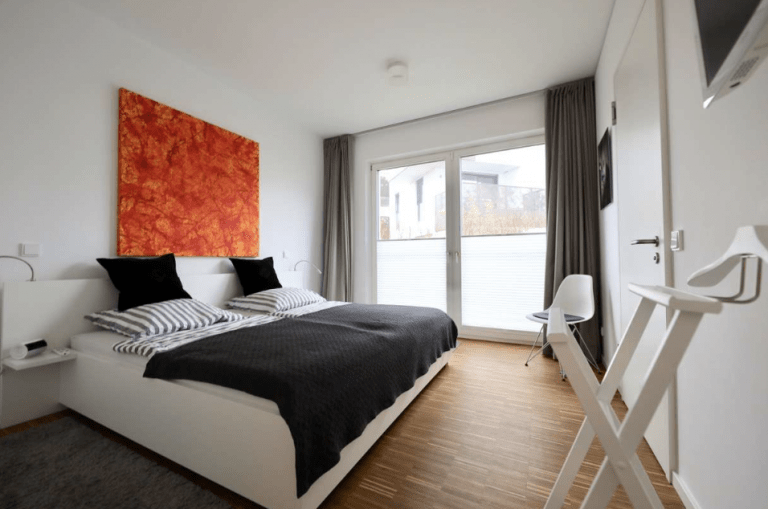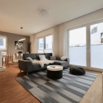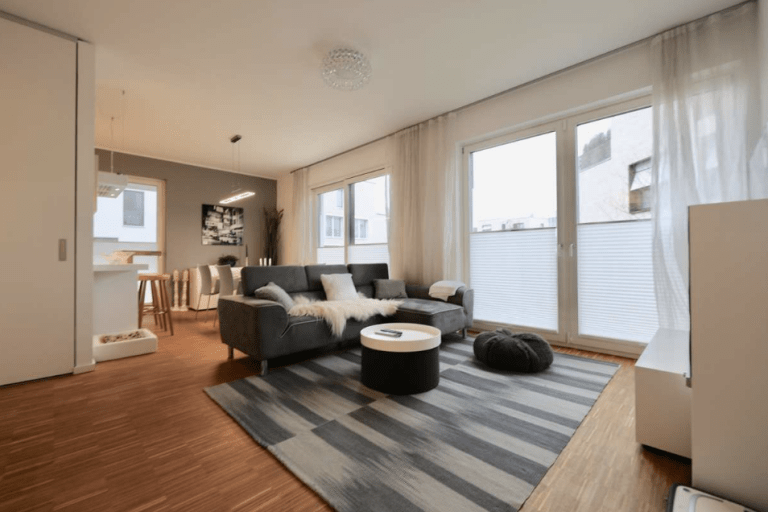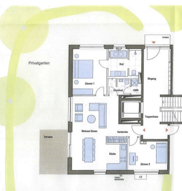 Die moderne und stilvoll ausgestattete Wohnung überzeugt durch einen guten Schnitt und gute Aussichten über bodentiefe Fenster mit Blicken in den Gartenbereich oder zum See.