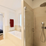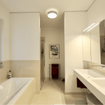 Der Eingangsbereich verfügt über einen Einbauschrank für die Garderobe. Ein Arbeits-/Gäste- oder Kinderzimmer bietet vielfältige Nutzungsmöglichkeiten, vielleicht auch als Sportraum? Der großzügige Wohn-/Essbereich mit Zugang zur Terrasse und in den Garten beinhaltet weiterhin eine offene Wohnküche von BULTHAUPT, die mit Elektrogeräten von MIELE ausgestattet ist. Im Duschbad für die Gäste ist ein Hauswirtschaftsraum integriert. Das Schlafzimmer verfügt über einen hochwertigen Einbauschrank sowie ein Badezimmer en-suite, ausgestattet mit einem Doppel-Waschbecken, einer Badewanne und einer separaten Dusche.