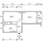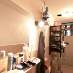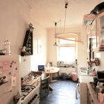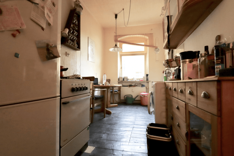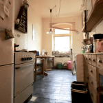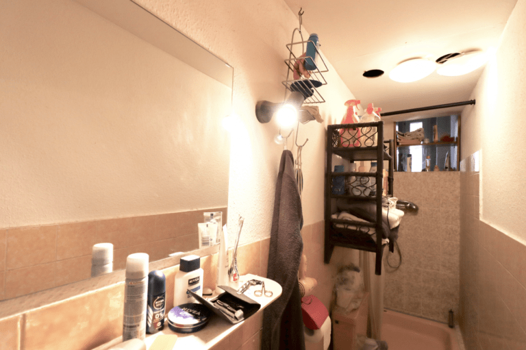 Das schmal geschnittene Duschbad verfügt über ein Oberlicht-Fenster und könnte durch die dahinterliegende Abstellkammer der Küche erweitert werden. Der Grundriss der Wohnung lässt es zu, dass man mit kleineren oder größeren Eingriffen die Küche und das Bad optimieren kann.