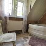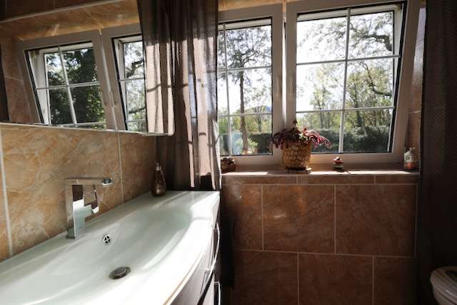 In der oberen Ebene sind zwei Schlafzimmer und ein Badezimmer mit einer Eckbadewanne und ein separates WC gelegen.