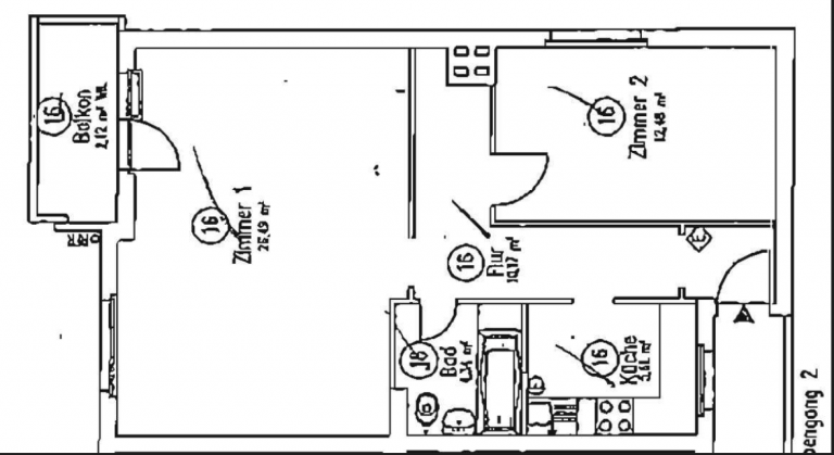 Die Kunststofffenster der Wohnung sind doppelt verglast, das Küchenfenster und das Balkonfenster sind aus Holz. Die Deckenhöhe beträgt ca. 2,50 m.