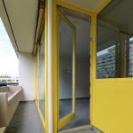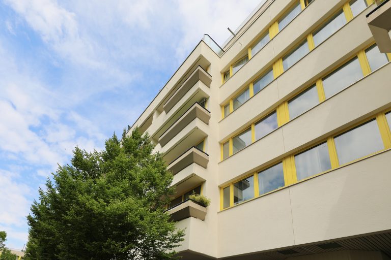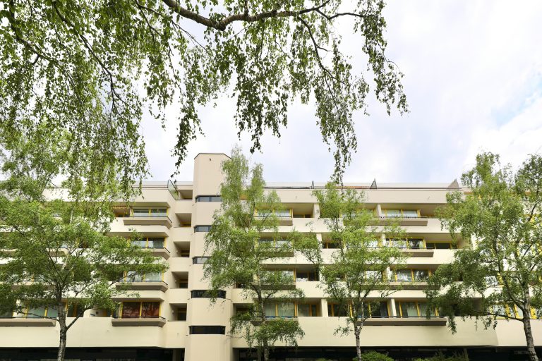 Durch die großen Fensterfronten ist die Wohnung sehr hell. Die zweifach verglasten Fenster sind aus Holz und mit Außenjalousien versehen, und die Wände sind tapeziert. Im Wohnraum ist Auslegware verlegt. Die Deckenhöhe beträgt ca. 2,50 m.