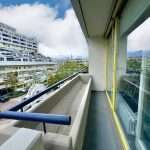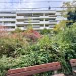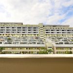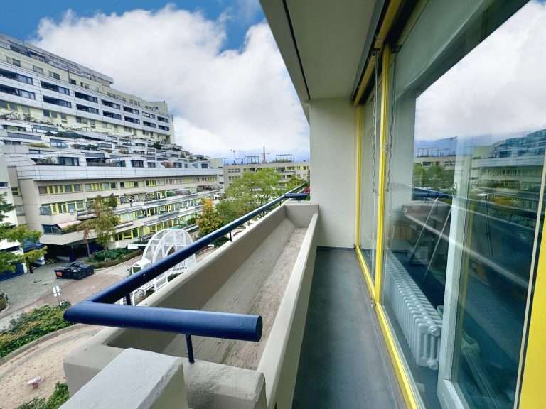 Die Loggia erstreckt sich über die gesamte Breite der Wohnung und bietet einen Blick in die begrünten Bereiche der weitläufigen Wohnanlage.
