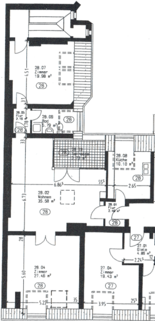 Vom Eingangsbereich aus ist auf der rechten Seite die Küche gelegen, geradezu gelangt man in das Wohnzimmer, von dort aus erschließt dich auf der linken Seite ein weiteres Zimmer und auf der rechten Seite eine Diele, die Zugang zu Bad, Balkon und einem weiterem Zimmer ermöglicht.