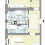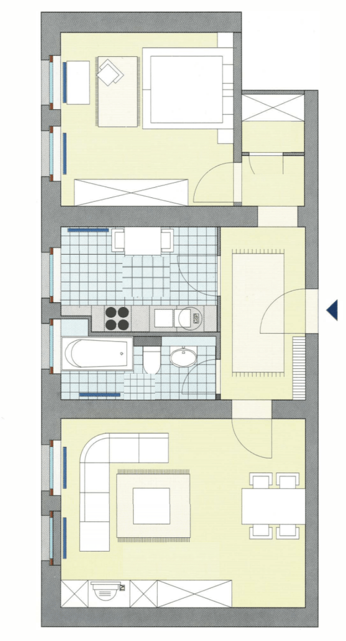 Eine Wohnfläche von ca. 59,67 m² verteilt sich auf einen Flur mit einer praktischen Abstellkammer, zwei Zimmer, eine Küche und ein tagesbelichtetes Wannenbad.