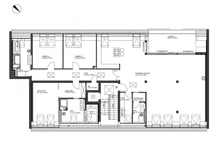 Dieser Bereich bietet Entfaltungsmöglichkeiten für einen großzügigen Wohn-/Essbereich mit offener Küche und wäre bei Bedarf auch teilbar für ein separates Arbeits- oder Gästezimmer. Die südwestlich ausgerichtete Terrasse ermöglicht einen gemütlichen Outdoor-Bereich.