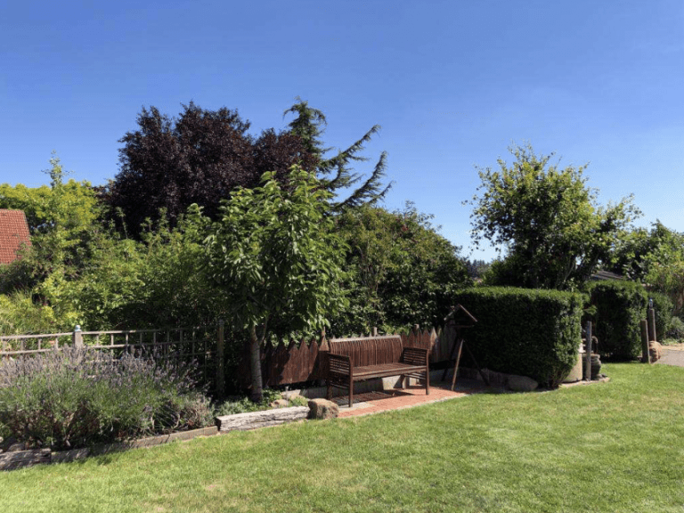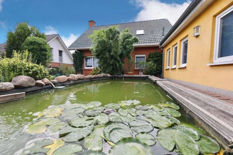 Der Vorgarten ist ebenfalls schön gestaltet, und ein Teich fügt sich dem Ganzen optisch wunderbar ein. In dem hier vorhandenen Holzhäuschen könnte optimal eine Sauna eingebaut werden.