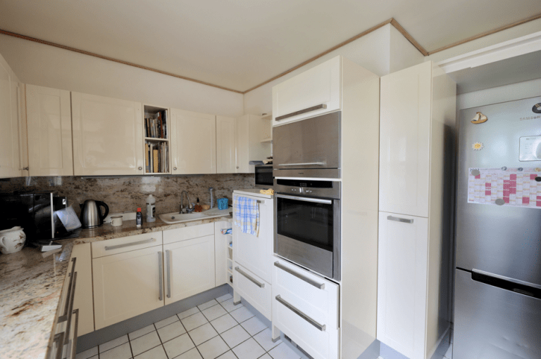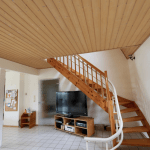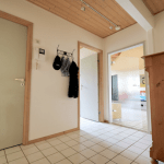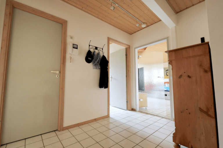 Der Boden im Erdgechoss ist mit praktischen, hellen Fliesen versehen, und im Obergeschoss ist Auslegware verlegt.