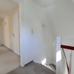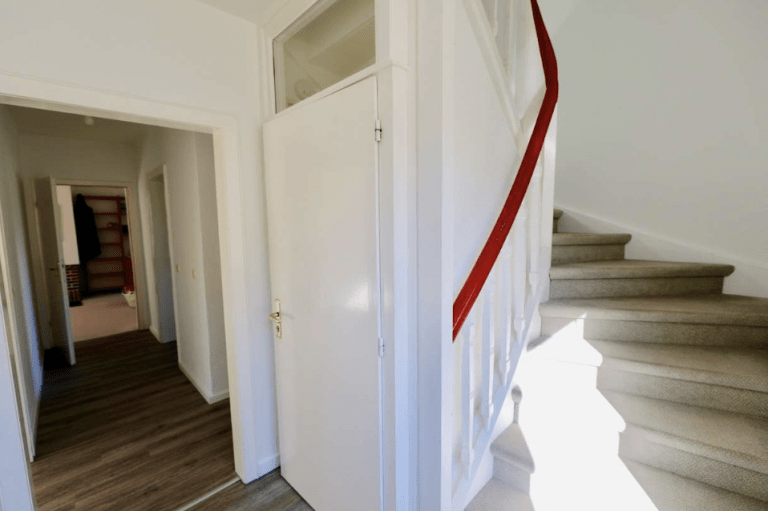 Die oberen Geschosse sind über eine geschwungene Holztreppe begehbar. Die Maisonette-Wohnung verfügt auf der unteren Ebene über ein Gäste-WC, eine Küche, ausgestattet mit einer Einbauküche, ein Schlafzimmer sowie über ein großzügiges Wohn-/Esszimmer, welches mit einem Kamin ausgestattet ist. In der oberen Ebene der Maisonette-Wohnung liegen das Duschbad und drei weitere Zimmer.